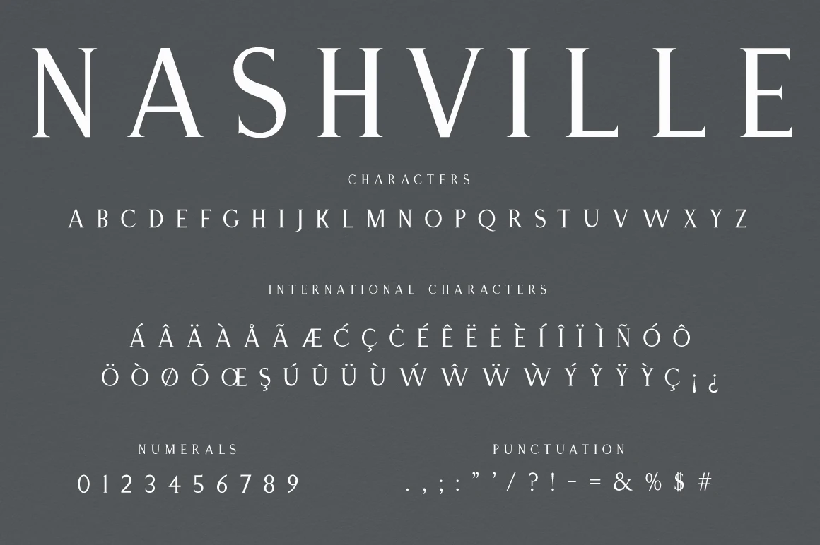 Nashville is an elegant all-caps serif typeface perfect for creating eye-catching, classically balanced typography. With subtle contrast and the sharpest serifs, it is designed to be readable, whether in headlines or subheads. Well-suited for crafting wedding invitations, logos, book covers, film titles, or any project that requires something stately or luxurious. Add a bit of polish to your designs with Nashville.