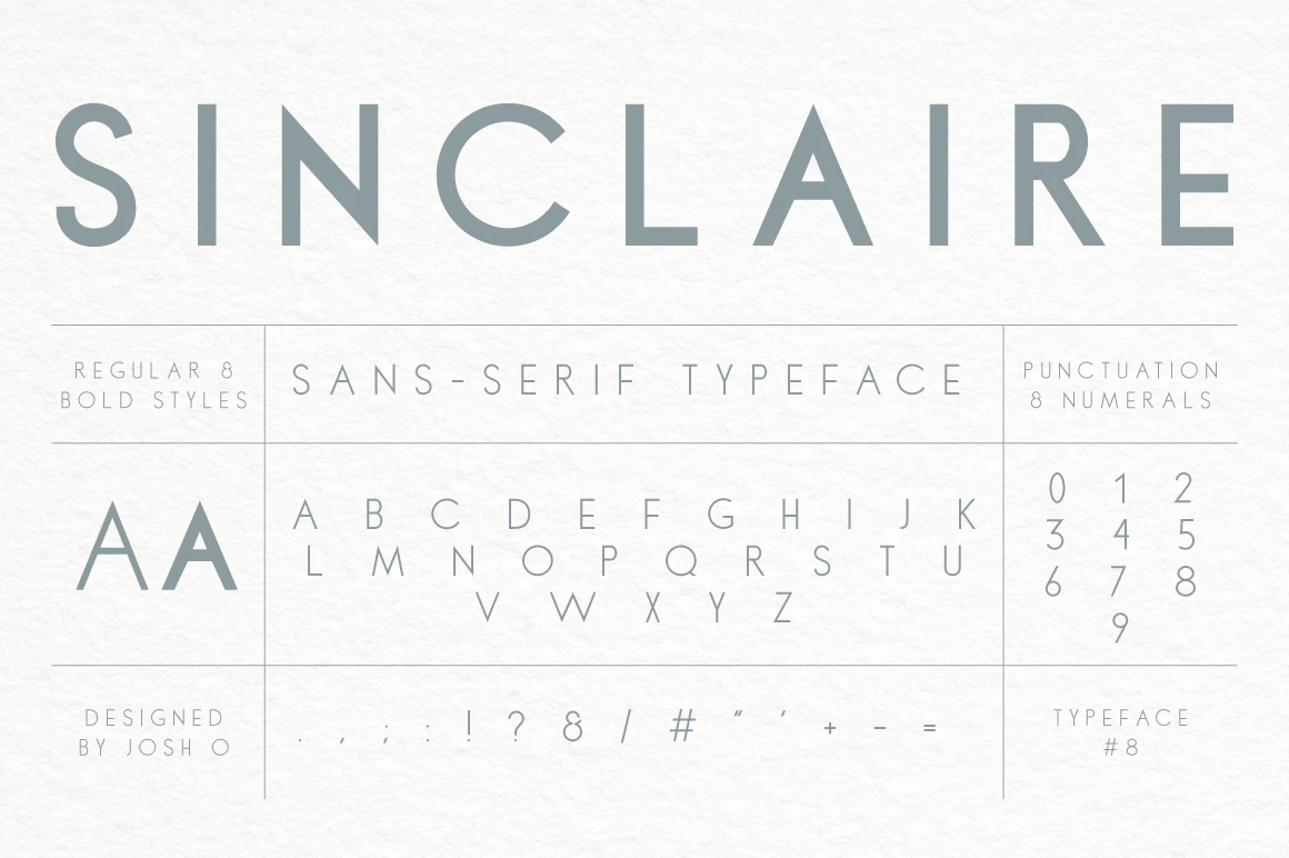Sinclaire is an all-caps Art Deco geometric sans serif with classic proportions—perfect for creating stylish film titles, magazine headlines, book covers, posters, and more.