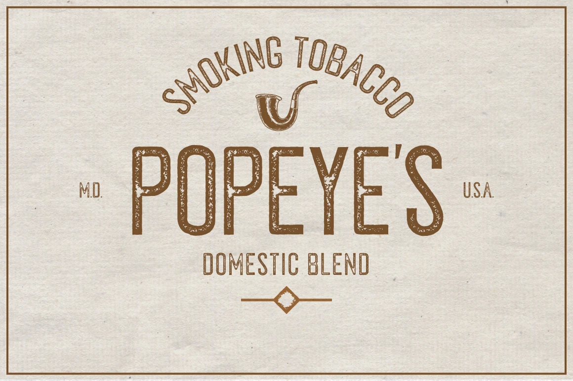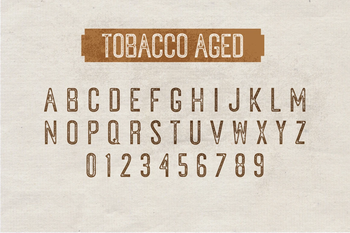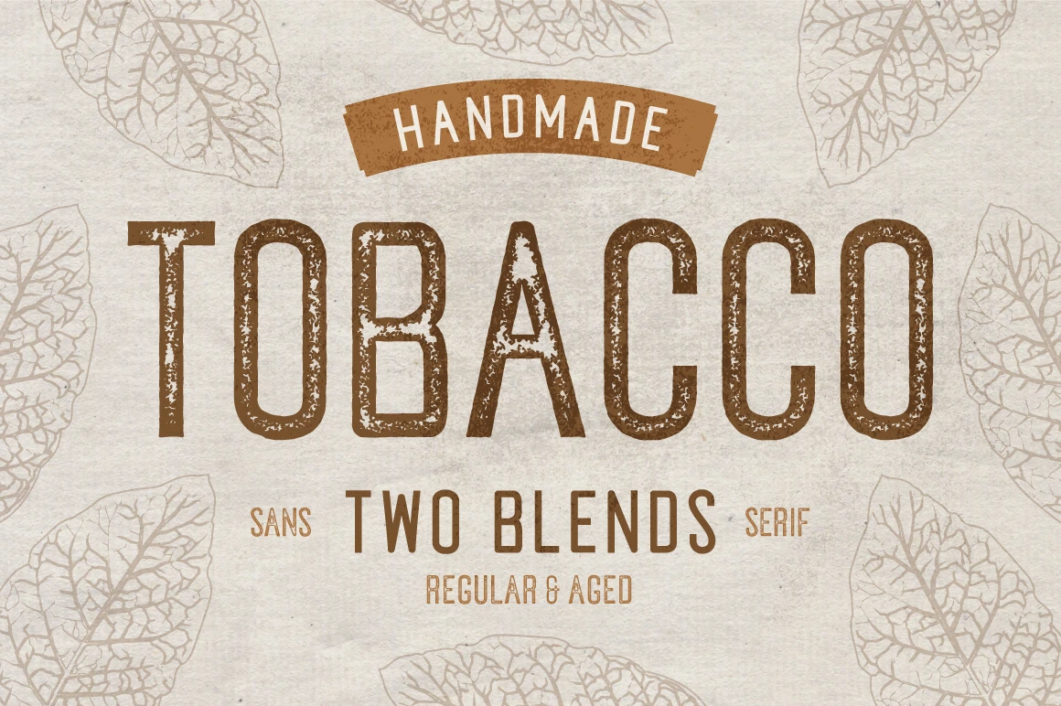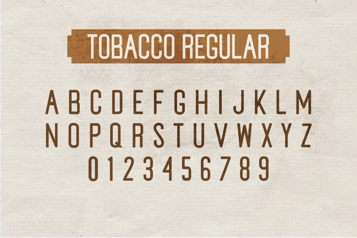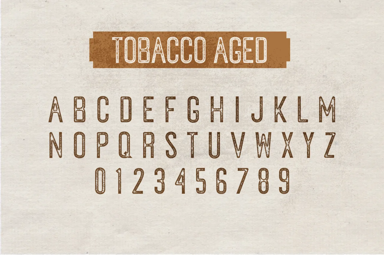 Tobacco is a handmade condensed sans serif. Designed in two styles: one is distressed and the other is clean. Use them separately or layer them to add simple versatility or a rough and gritty texture to all kinds of display typography. Use this hand-drawn font family to create a unique, vintage aesthetic for fashion labels, brand assets, book covers, movie posters, festival graphics, and nearly any project that requires a stovepipe sans with character.