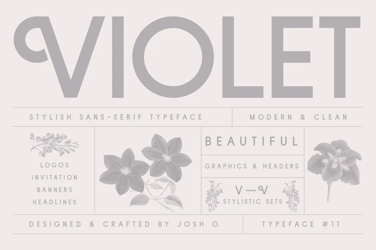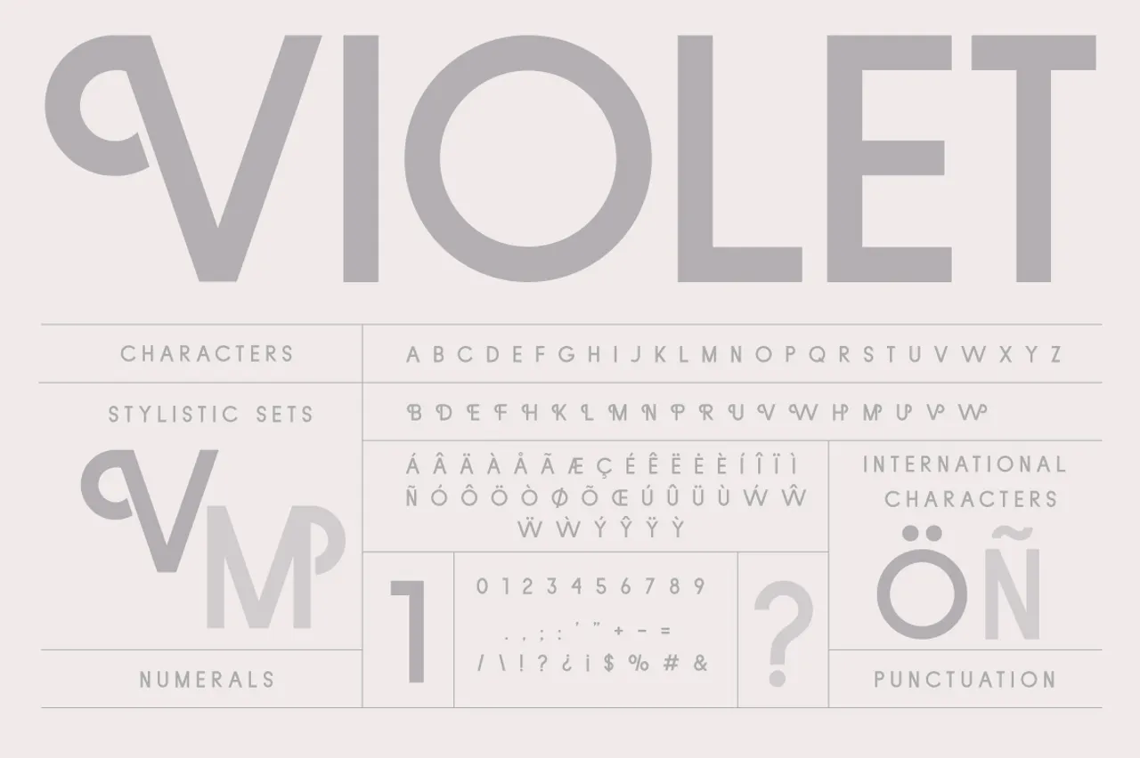 Violet is a geometric sans serif striking a balance between tradition and individuality—ideal for creating display graphics, wedding invitations, logos, headers, and more.